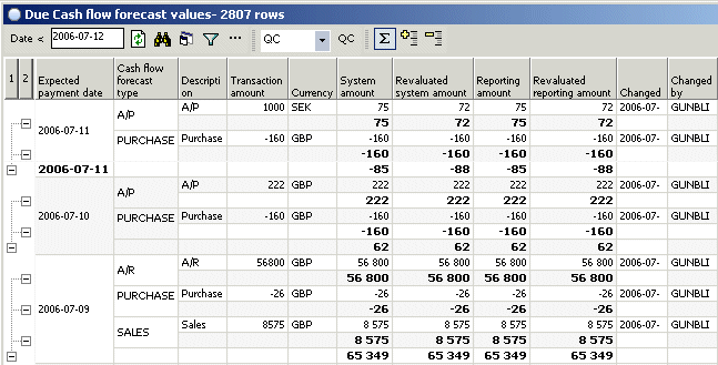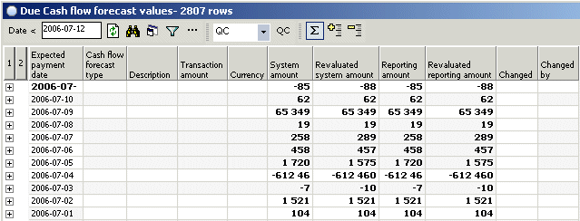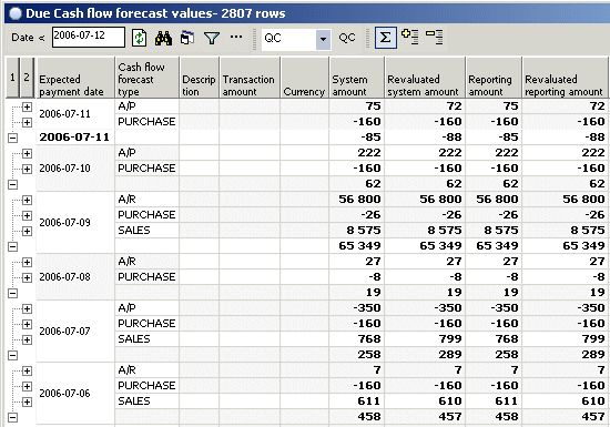 Click column 2 to expand the panel to show a summary per expected payment date, Cash flow forecast type and currency:
