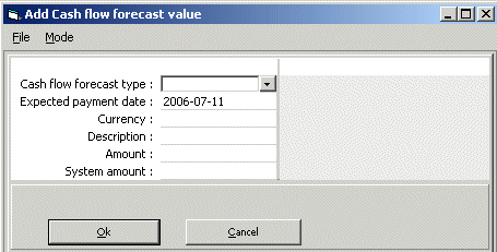 - Enter, or select from the dropdown menu, the type of expected payment. Note: It is not possible to enter cash flow forecast values manually for automatic cash flow forecast types, i.e., those with an update program defined. The update program is used to update the expected payments for the cash flow forecast type into the Cash flow balance file. See Maintain cash flow forecast types for further instructions.