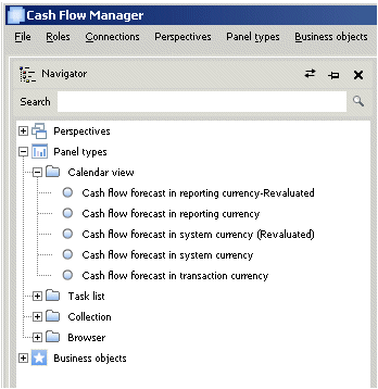 All functions or processes supported in CFM are defined by their own Perspective (e.g., cash flow forecast values, sales orders and purchase orders). You can easily switch between the defined perspectives in your role, but only one perspective can be active at a time. The Perspective you are currently working with is shown in the title of the Workspace. You can customise your own perspective and define it as your Startup perspective. See Customise a perspective.