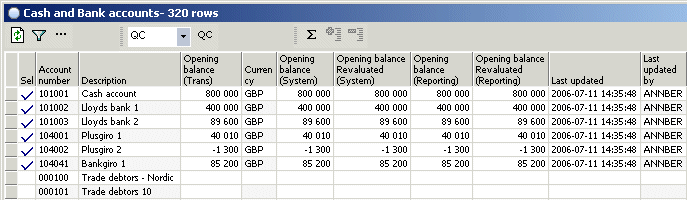 - You access the Cash and bank accounts view with all active main balance accounts defined in DC1: