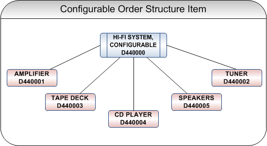 The amplifier and the tuner will be mandatory items in this configurable order structure item. The customer can decide to include either the tape deck or the CD player, or both, in the package. The customer will also be able to select speakers with different wattage.