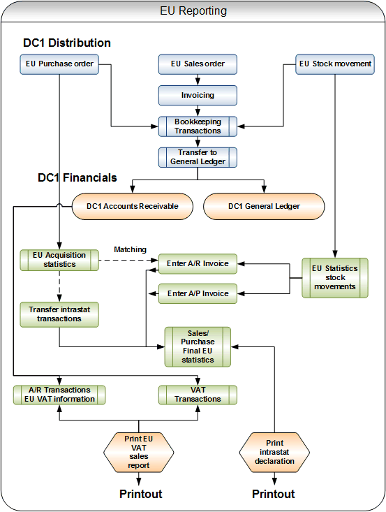 Home /User Guides/Distribution/EU Reporting EU Reporting Related topics Flowchart Several routines in DC1 Distribution are influenced by the EU reporting functionality (EU VAT sales report and INTRASTAT declaration). Related topics EU order handling EU stock handling Country functionality Standard features